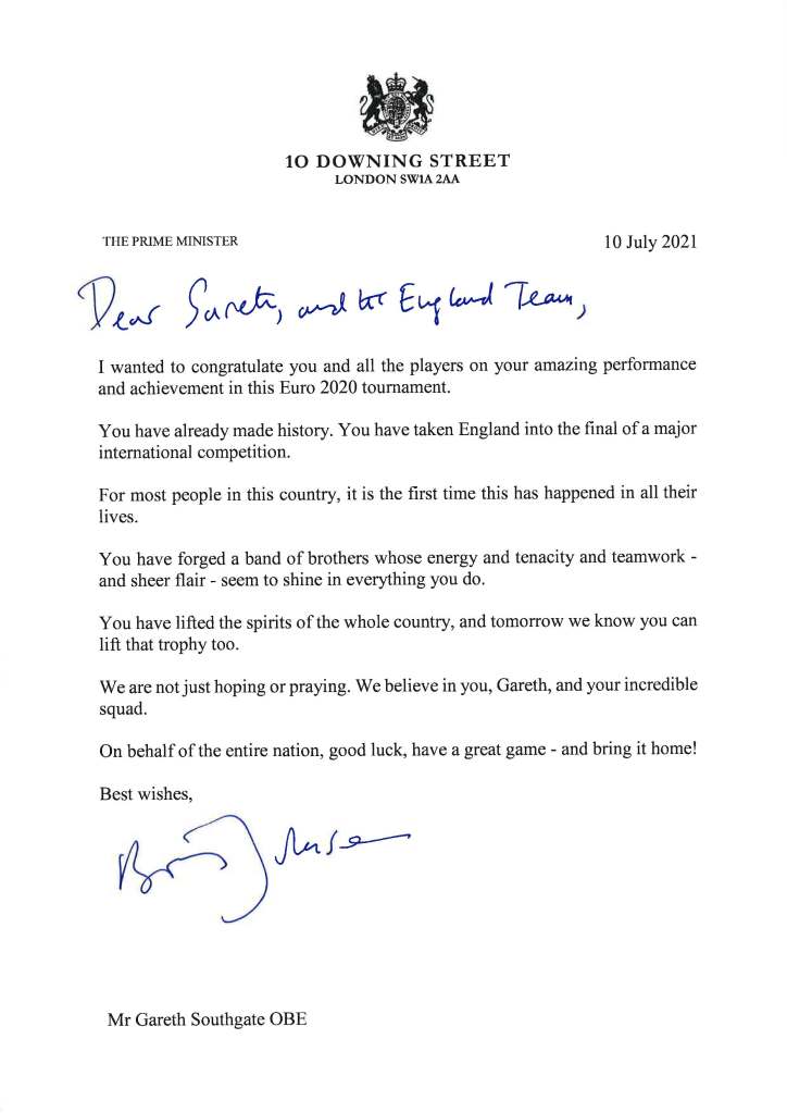 Ahead of England’s clash against Italy, The Prime Minister has written to Gareth Southgate and the @England team ahead of the #EURO2020 final this evening against Italy.