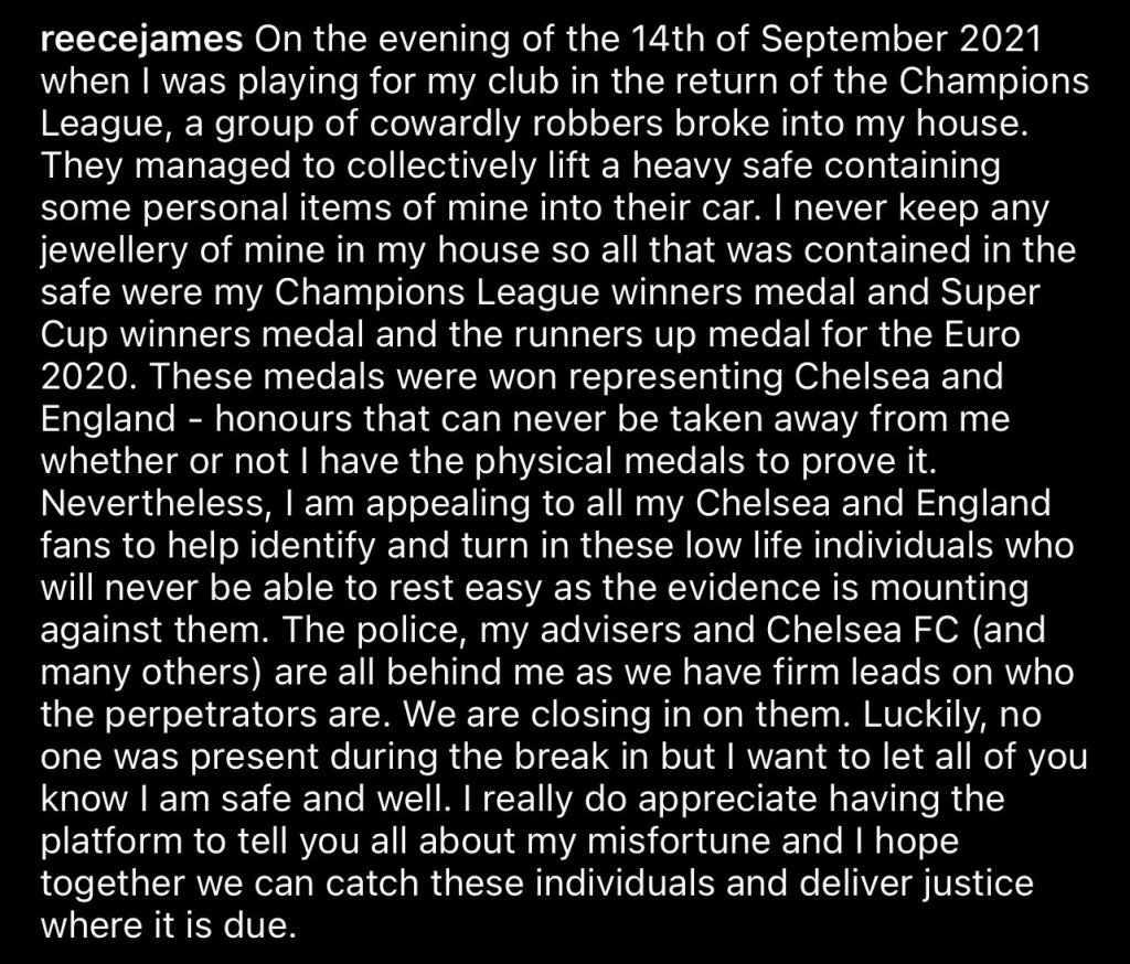 Reece James has confirmed that a safe containing his Champions League winners medal was stolen over night while he was playing at Stamford Bridge on against Zent Tuesday night 😡