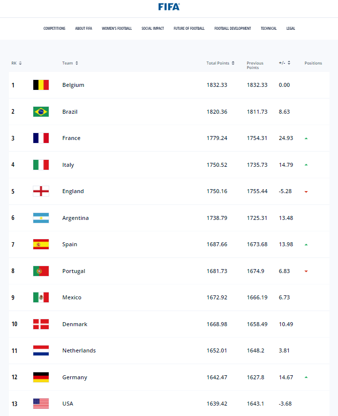 FIFA World Ranking: Belgium stay on top, Italy move up to No.4